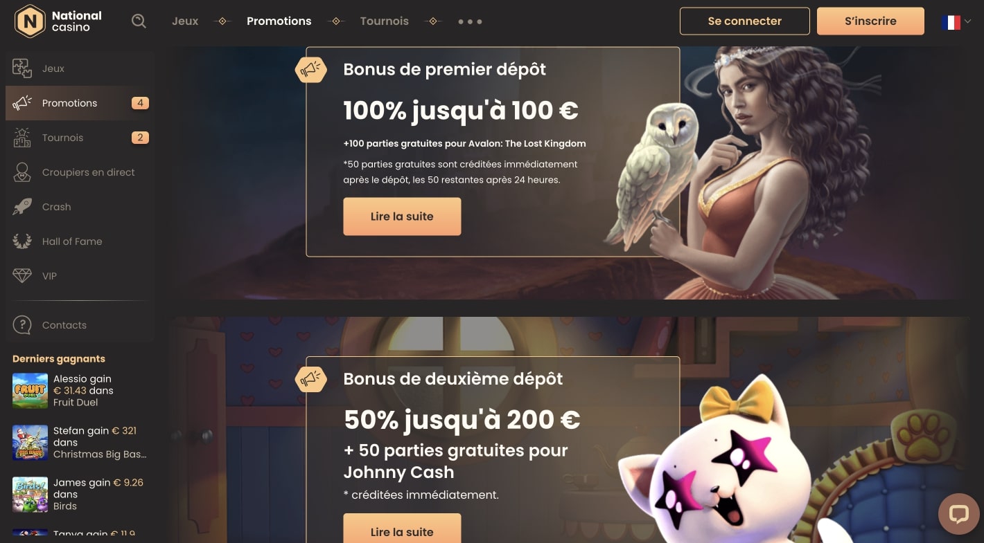 L’une des principales caractéristiques de National Casino est le nombre de bonus que ce site propose. Comme point de départ, le bonus de bienvenue comporte deux parties. Pour les deux premiers dépôts, les nouveaux joueurs peuvent augmenter leur bankroll et obtenir en plus de nombreux bonus de free spins dans différents types de jeux de machines à sous.