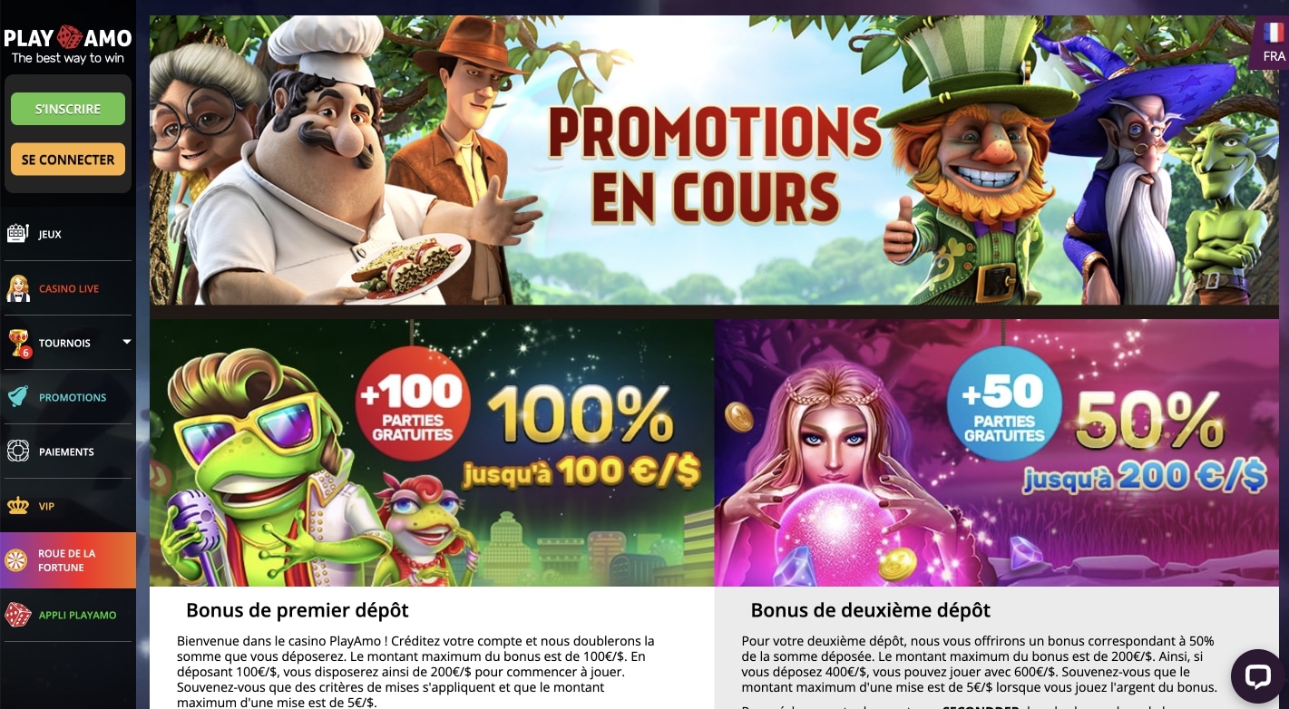 Le bonus Playamo Casino sur le premier dépôt est de 100 % sur un maximum de 100 euros, plus 100 free spins répartis sur 5 jours. Le deuxième dépôt est récompensé à hauteur de 50 % sur un maximum de 200 euros, plus les free spins qui font partie du bonus Playamo. Les joueurs profitent de 50 free spins supplémentaires dans l’espoir d’une bonne collaboration avec le générateur de nombres aléatoires. Le bonus de bienvenue est en principe le bonus le plus intéressant pour le nouveau client dans un premier temps. Le crédit bonus permet de découvrir le fournisseur, de tester de tout nouveaux jeux et éventuellement de décrocher de jolis gains une fois les conditions de mise remplies.