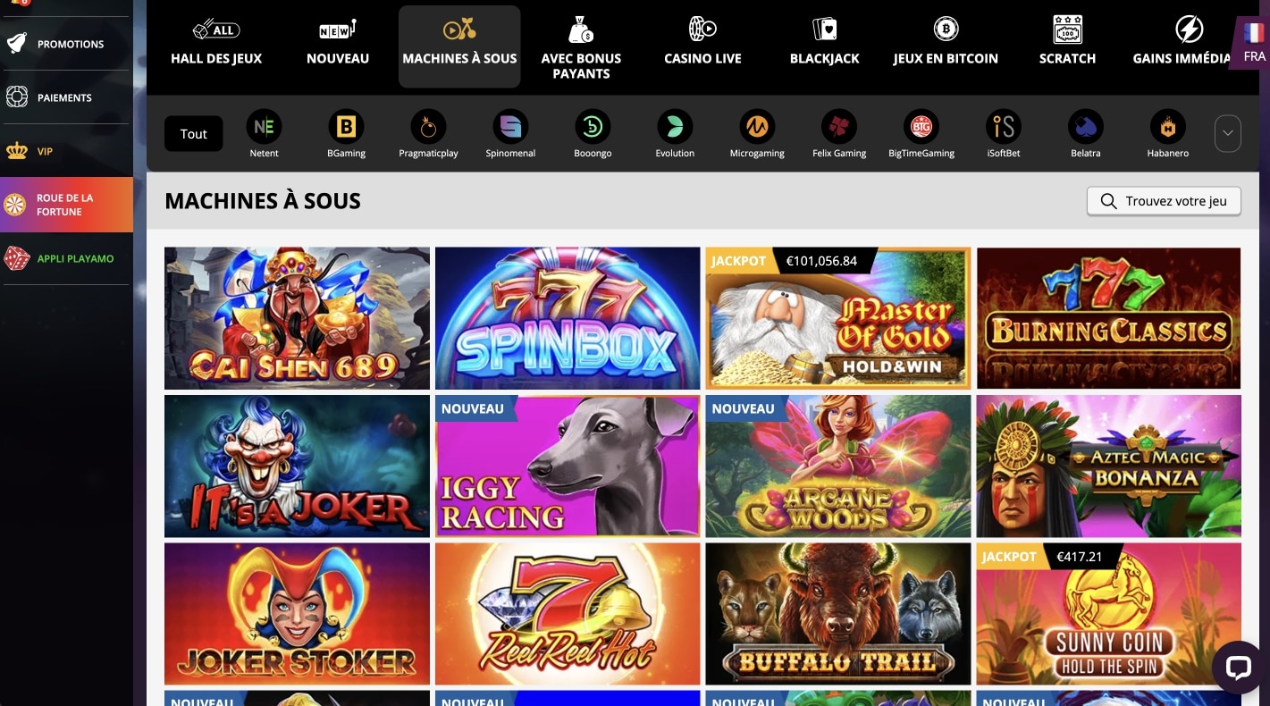Le casino Playamo est doté d’un large assortiment, notamment de jeux populaires de grande qualité, sur tous les thèmes imaginables, proposés par des développeurs de logiciels renommés. Casino Suisse Playamo, dont le propriétaire est Direx N.V. Casinos, travaille avec des développeurs établis, comme par exemple NextGen Gaming, Microgaming, Thunderkick, Amatic Industries, EGT, Endorphina, Ezugi, etc. Il n’est pas possible de présenter chaque fournisseur individuellement. L’offre et le choix de jeux vous surprennent ? Il y a effectivement un jeu adapté à chaque joueur, les machines à sous favorites sont essayées. Playamo, de la main de Direx N.V., est absolument compétitif, l’entreprise dispose d’une grande réputation.
