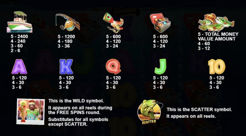 Das zweite Symbol, die Angel sorgt bei fünfmaligem Auftauchen für 120 Euro, dieses Symbol vergibt Gewinne nach dreimaligem Erscheinen. Das nächste Symbol ist ein Angelköder, der nur die Hälfte wert ist als das vorherige Symbol. Dann folgt die Box, Angelutensilien enthaltend, um von einer Ansammlung von Fischen abgelöst zu werden. Die kleinen Fische verfügen über unterschiedliche Geldwerte, die im Gewinnfall Geldpreise sind. Die Buchstaben A, K, Q, J und die Zahl 10 sind die Symbole, die wenig Wert bringen. Alle fünf Symbole vergeben bei fünfmaligem Erscheinen 12 Euro, bei dreimaliger Sichtung 0,60 Euro.