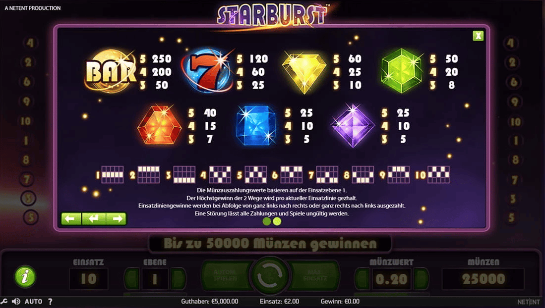 Schon mit 0,10 Euro Einsatz ist Starburst spielbar. Erwähnenswert sind die Re-Spin Features des Online Slots, die NetEnt raffiniert eingebaut hat. Wenn niemand damit rechnet, erscheinen plötzlich die Re-Spin Überraschungen, welche das Spielerlebnis nochmals eine Stufe höher stellgelden. Die Starburst Slot Machine ist auffallend mit den glitzernden Diamanten, woraus sich dann urplötzlich ein Stern erhebt. Der Sinn des Spiels ist, durch unkomplizierte Bedienung trotzdem den einen oder anderen stattlichen Gewinn zu ergattern.