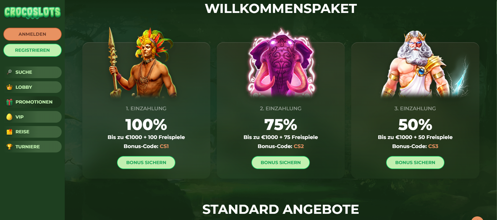 Der Willkommensbonus bei CrocoSlots Casino ist ein dreiteiliges Paket , das sowohl Bonusgeld als auch Freispiele beinhaltet. Um bis zu 3.000€ und 225 Freispiele abzustauben, benötigst du einen Bonuscode. Hier erkläre ich dir den Willkommensbonus im Detail und die wichtigsten Bedingungen für Bonus Codes, Freispiele und Umsatzanforderungen.