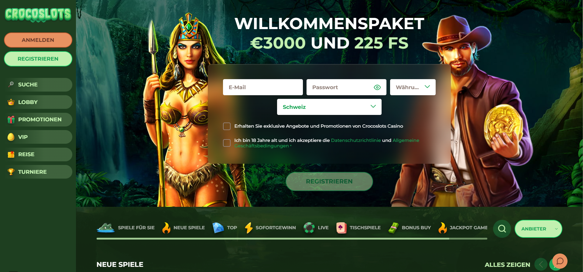 Gehe auf die CrocoSlots Casino Webseite und klicke auf den «Anmelden» oder «Registrieren» Button. Du wirst aufgefordert, einen Benutzernamen, eine E-Mail-Adresse sowie ein Passwort einzugeben. Stimme den Allgemeinen Geschäftsbedingungen zu und klicke auf «Weiter». Bonus code CS1 nicht vergessen!