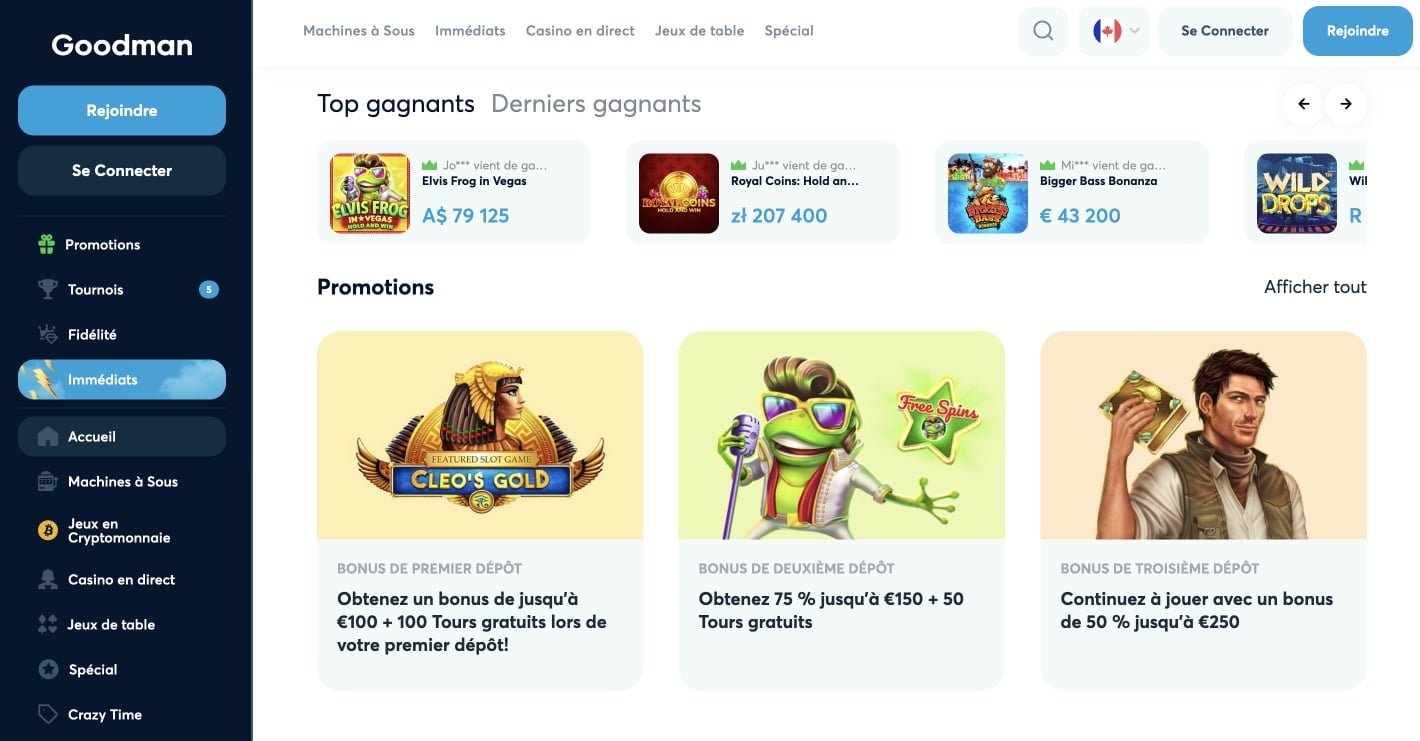 Als besondere Features, kann man bei Goodman Casino die Turniere und Crazy Time entdecken.