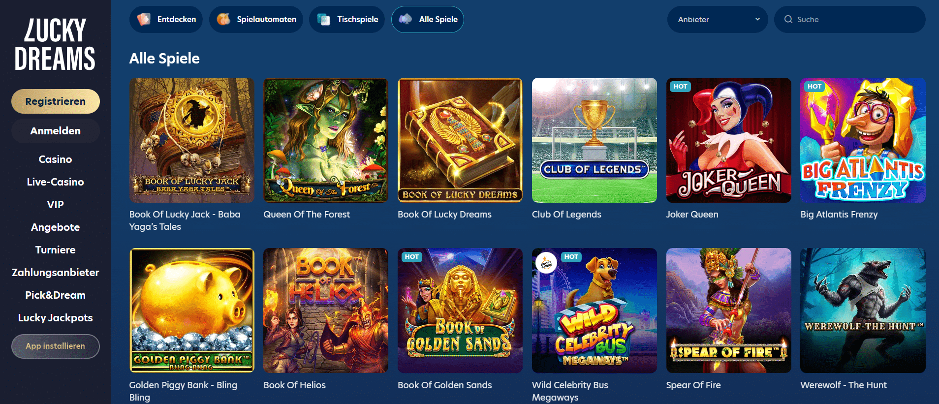 Lucky Dreams Casino präsentiert eine beeindruckende Vielfalt an Casino-Spielen, die von mehreren renommierten Software-Anbietern bereitgestellt werden. Die Spielebibliothek umfasst mehrere hundert Titel, die in verschiedene Kategorien eingeteilt sind, darunter Slots , Tischspiele, Live-Casino-Spiele , progressive Jackpot-Spiele und mehr.