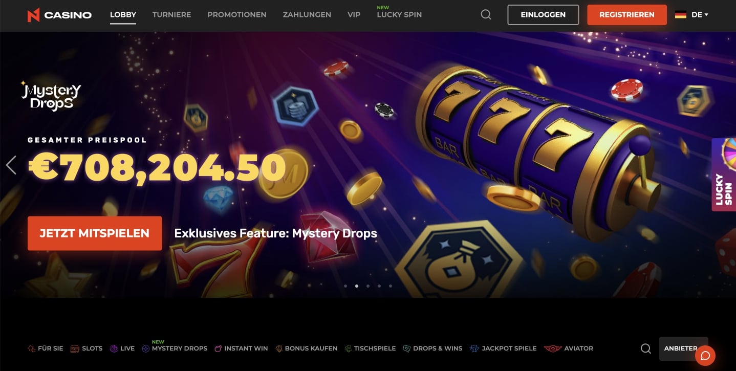 Neben den Standardspielen und Boni bietet das N1 Casino auch spezielle Funktionen wie Mystery Drops und Bonus Buy-Spiele , die für zusätzliche Aufregung und Gewinnmöglichkeiten sorgen. Außerdem bietet das Casino aktuell das Turnier ‘ Brechen Sie die Regeln ’, bei dem es einen Preispool von bis zu 1 Millionen Euro zu gewinnen gibt. Des Weiteren gibt es aktuell das Turnier ‘ Spinomenal ’. Wie der Name erahnen lässt, können Sie durch Spins in ausgewählten Slots einen Preispool von bis zu 200 tausend Euro. Derzeit gibt es auch das Turnier ‘Drops & Wins', bei denen Preise von insgesamt 2 Millionen Euro zu gewinnen sind. Sie können ganz einfach teilnehmen, indem Sie sich dafür anmelden und beginnen, an ausgewählten Slots zu spielen. Vielleicht gehören Sie zu einem der glücklichen und stauben Gewinne ab , die Ihr Leben verändern könnten.