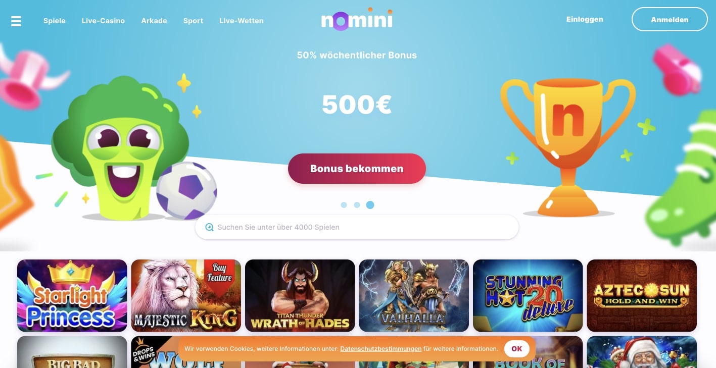Das Nomini Casino punktet mit der aufmunternden Webseite, dem gigantischen Spielangebot, dem vortrefflichen Live Casino und dem besonderen Nomini Bonus. Die Kunden fühlen sich nach eigenen Aussagen wohl in diesem Online Casino. Die Auswahl des geeigneten Neukundenbonus ist nicht gebräuchlich, finden viele Spieler jedoch sehr gut.