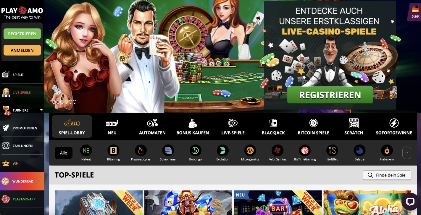 Das Playamo Casino punktet mit mehr Vorteilen als Nachteilen . Das große Spielsortiment mit ca. 1.400 Slots beinhaltet für jeden Spieler eine Möglichkeit zu gewinnen. Die Fans von Kryptowährungen kommen sozusagen auch auf ihre Kosten, denn das Casino akzeptiert ausser den herkömmlichen Zahlungsanbietern zusätzlich Kryptowährungen. Viele Spieler sind vom Live Casino überzeugt, dort hat der legendäre Spiele-Entwickler Evolution Gaming das Sagen. Live Dealer spielen im Live Casino mit Ihnen. Baccarat Spiele u. ä. sind absolute Highlights, das gut ausgestattete Live Casino ist für viele Spieler das Nonplusultra, dieser Top-Anbieter ist erste Wahl.