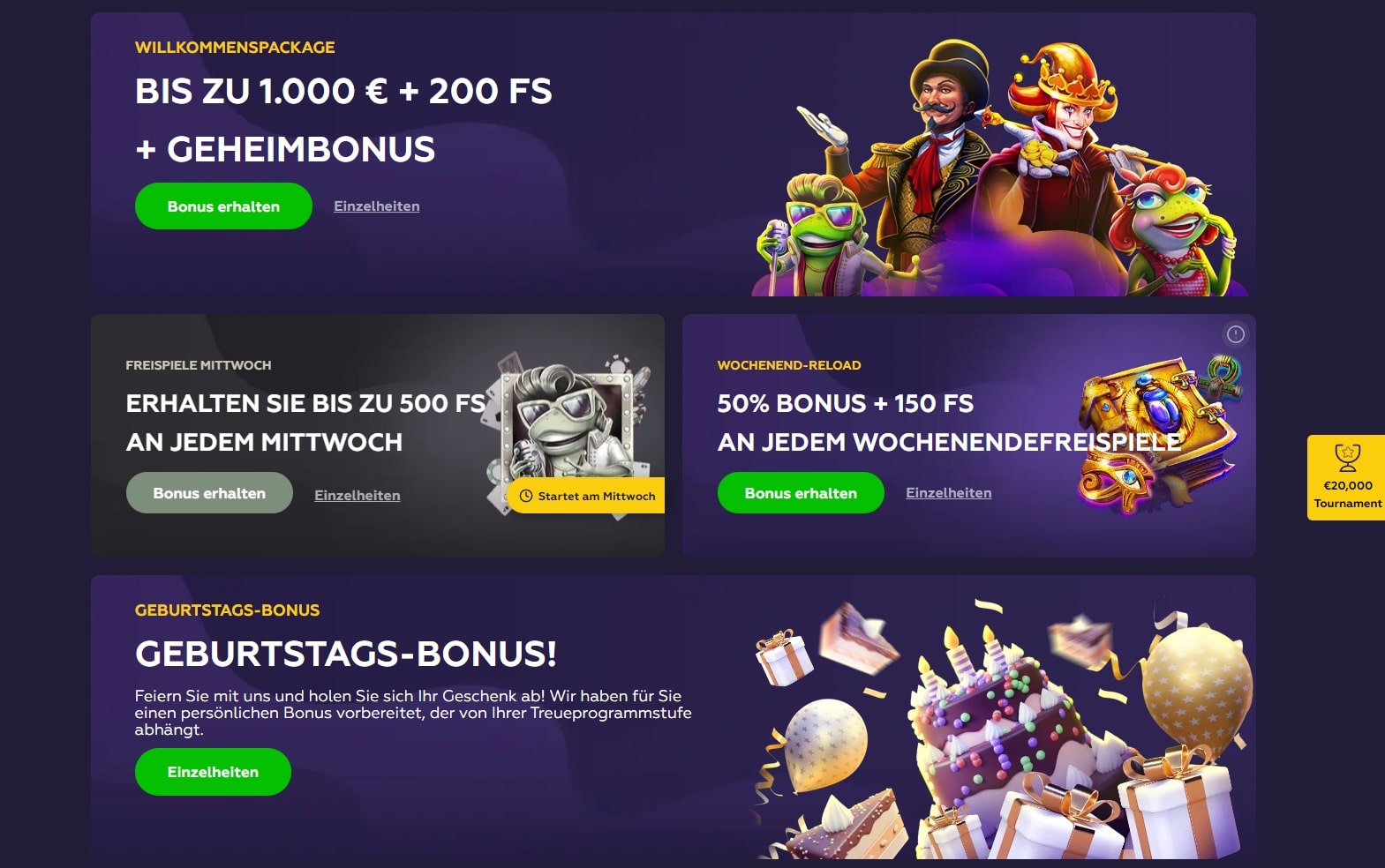| Dritte Einzahlung | 50% | 500 Euro | 100 Freispiele | 20 Euro | 40x |