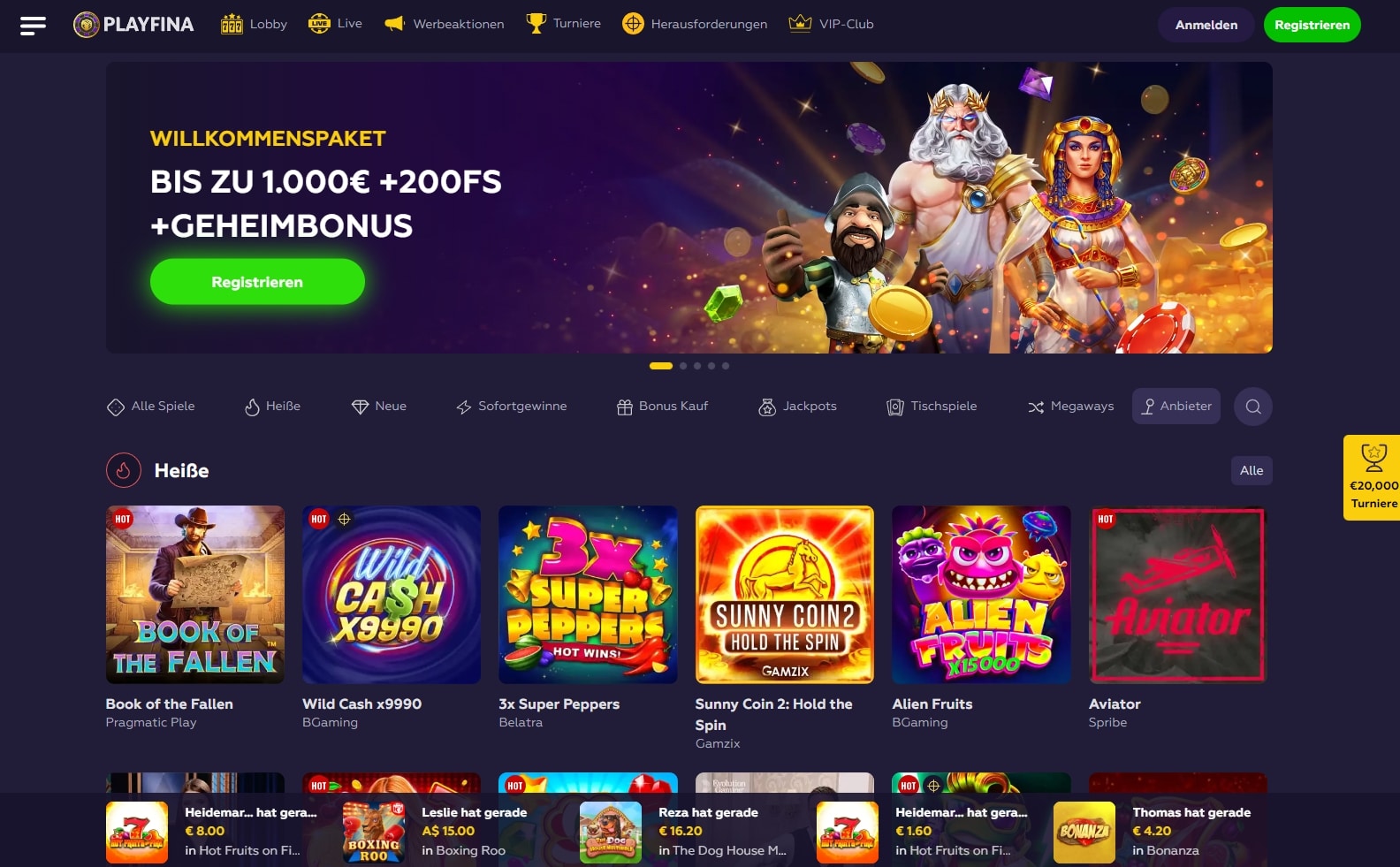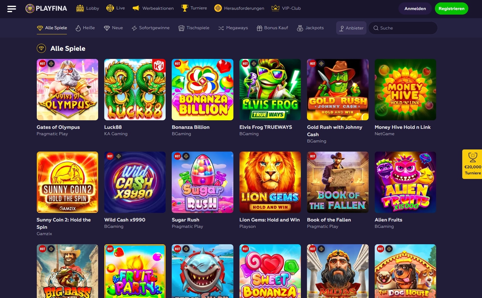 Sobald Sie den Playfina Casino Bonus erhalten haben, können Sie aus einer Vielzahl von Spielen wählen und versuchen, Geld zu gewinnen. Vielleicht gehört einer der Jackpots schon bald Ihnen. Viel Glück!