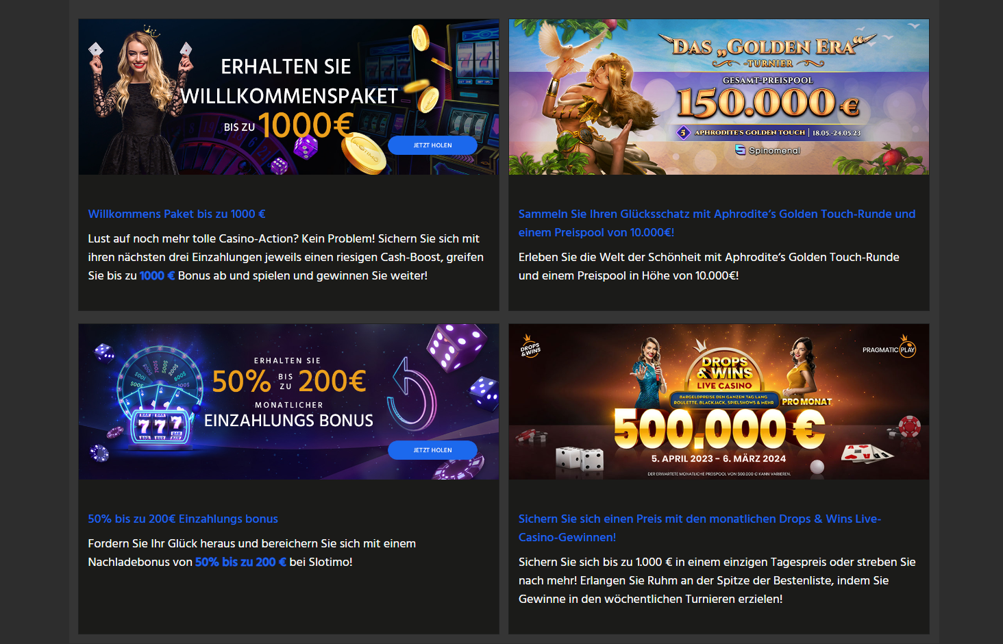 Slotimo Casino bietet in der Regel verschiedene Arten von Bonusangeboten an, um neue Spieler anzuziehen und bestehende Spieler zu belohnen. Dazu gehören unter anderem Willkommensboni, Freispiele, ein Reload-Bonus, Cashback-Angebote und Treueprogramme.