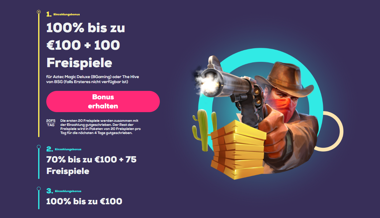 | Erste Einzahlung | 100 Freispiele | Kein Code |