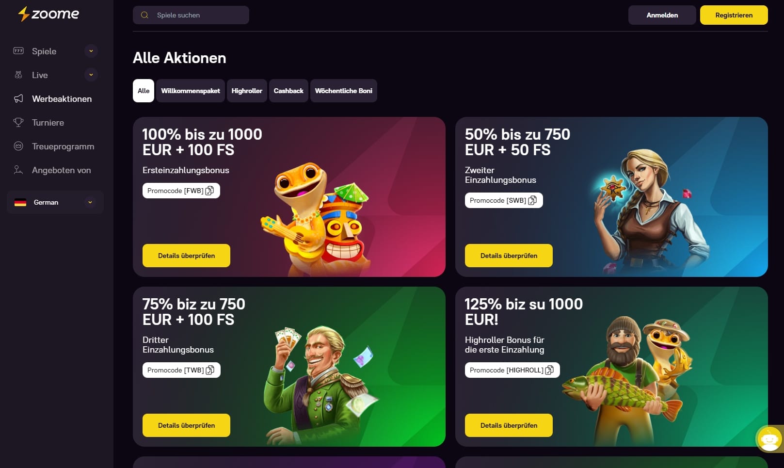 Das Willkommensbonus-Paket von Zoome bietet den Spielern einen Bonus auf ihre ersten drei Einzahlungen. Um diesen Willkommensbonus zu erhalten, müssen die Spieler einen Mindesteinzahlungsbetrag von 20 EUR/USD tätigen und den entsprechenden Zoome Bonus Code verwenden.