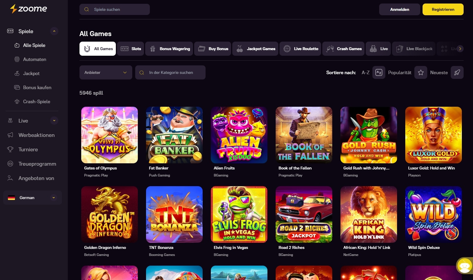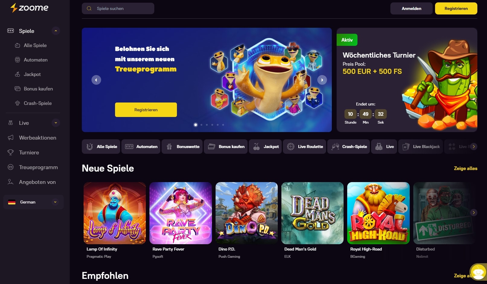 Wählen Sie aus einer großen Spielauswahl, darunter Slots, Tischspiele, Live-Casinospiele und vieles mehr. Das Zoome Casino arbeitet mit den führenden Anbietern von Online-Casinospielen zusammen, um Ihnen ein unvergessliches Spielerlebnis zu bieten.